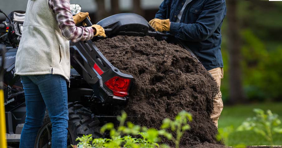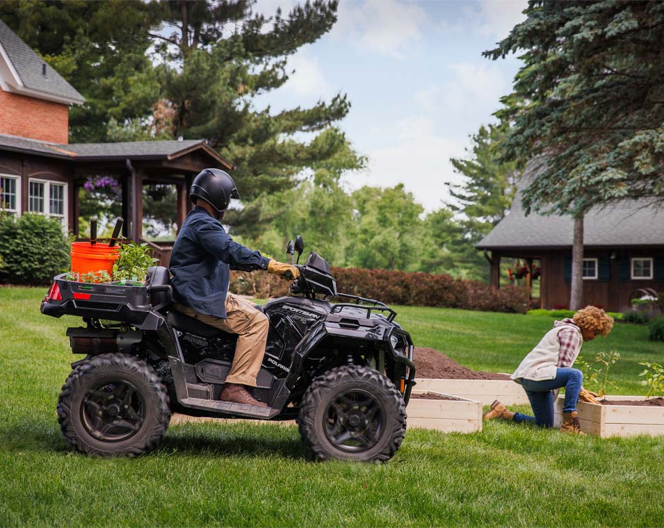 Le Sportsman X2 570 vous aidera à faire face à tous les travaux  grâce à sa capacité de traction énorme de 830 kg et de chargement de 181 kg de la benne basculante.