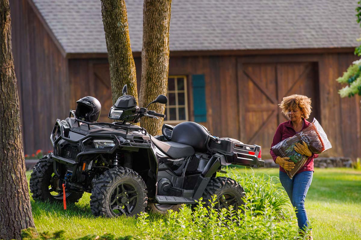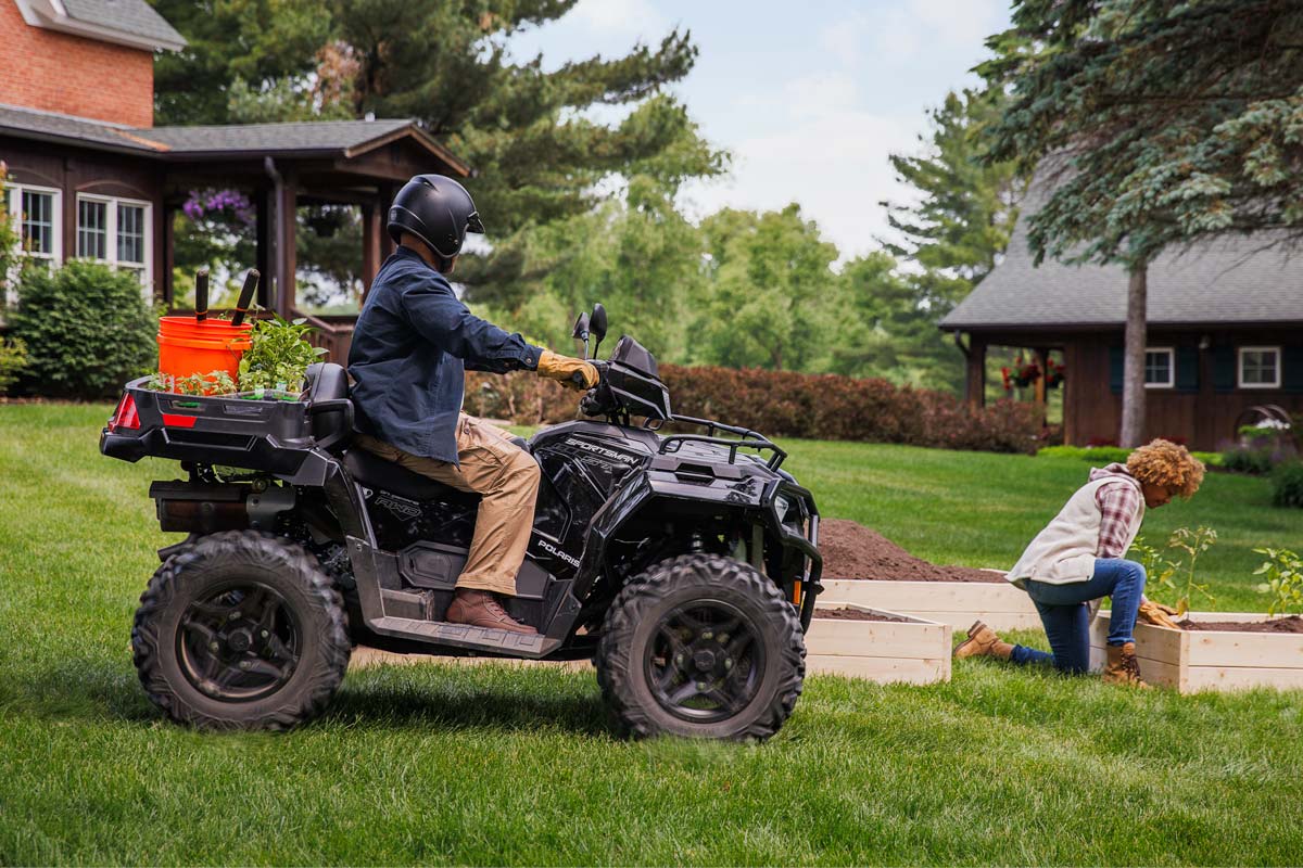 Le Sportsman X2 570 vous aidera à faire face à tous les travaux  grâce à sa capacité de traction énorme de 830 kg et de chargement de 181 kg de la benne basculante.